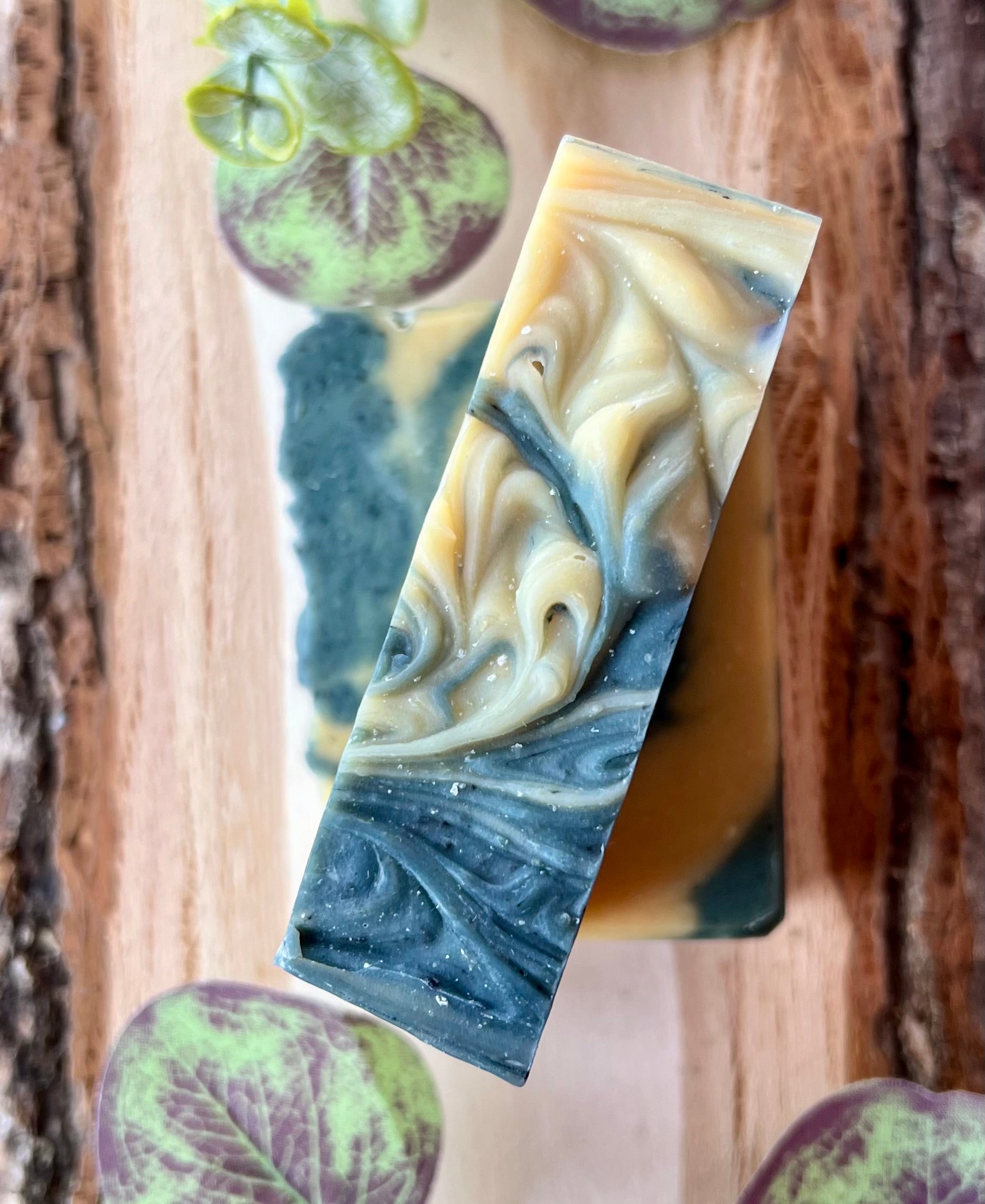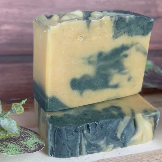 INGREDIENTS: 100% Saponified Olive Oil, Shea Butter, Coconut Oil, Castor Oil, Ridgefield Farm Goats Milk, (Peppermint, Lemongrass, and Rosemary) Essential Oils, Indigo powder, and Kaolin Clay.
